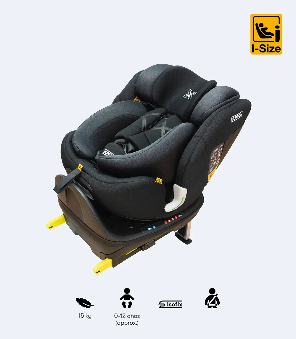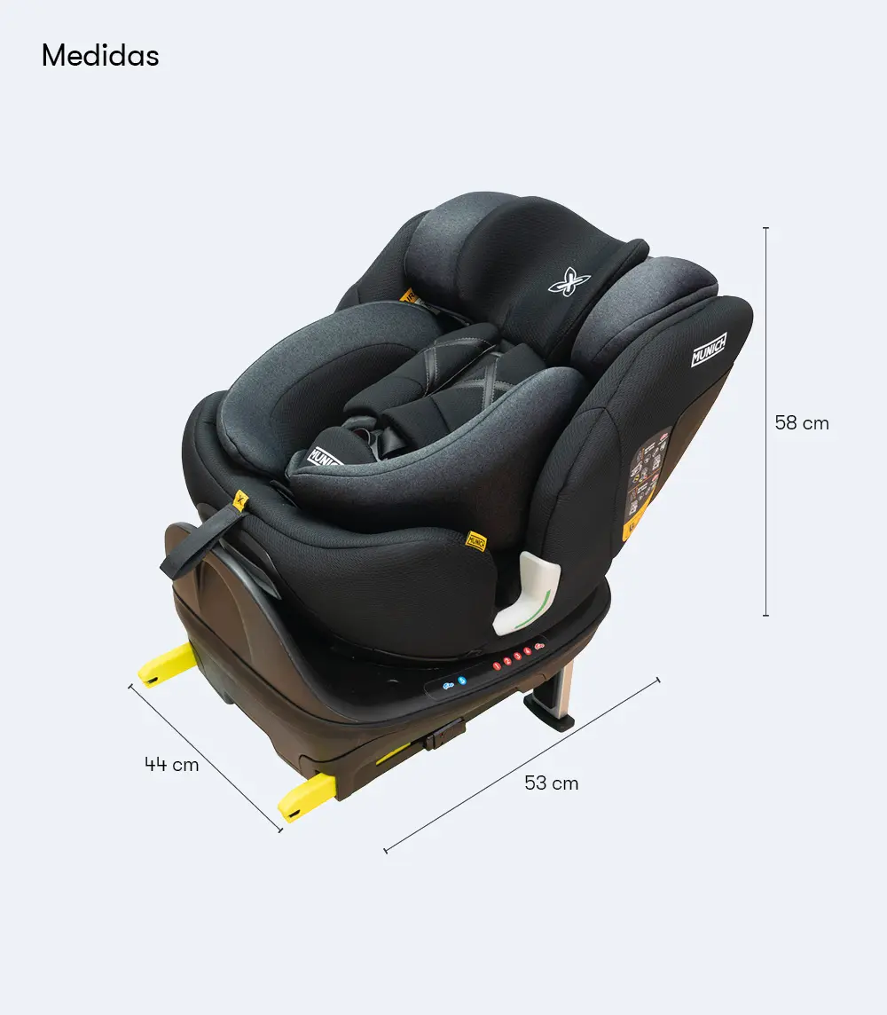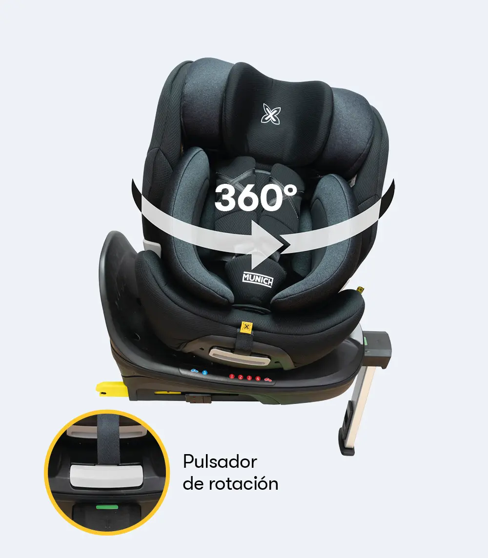 Sistema rotativo total 360º. La silla gira libremente respecto a la base, lo que facilita la colocación del niño al girar la silla en dirección a la puerta del vehículo.